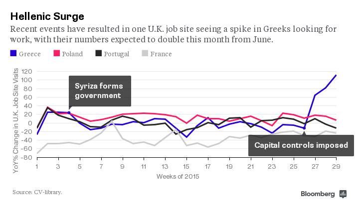 Το μεγάλο… κύμα προκλήθηκε μεταξύ του Ιουνίου και του Ιουλίου, περίοδος που περιλαμβάνει τις δύσκολες διαπραγματεύσεις της Αθήνας με τους δανειστές, την πιθανότητα ενός Grexit και στη συνέχεια την επιβολή των capital controls. Όλα αυτά επέτειναν την ανησυχία πολλών Ελλήνων με αποτέλεσμα να αρχίσουν να σκέφτονται έντονα τη μετανάστευση στη Γηραιά Αλβιόνα.