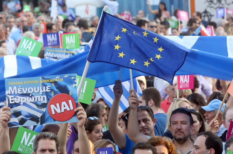 «Ναι στην Ελλάδα, Ναι στο ευρώ», φώναξαν υποστηρικτές του «Ναι», οι οποίοι μαζικά συγκεντρώθηκαν στην πλατεία Αγίας Σοφίας στη Θεσσαλονίκη.