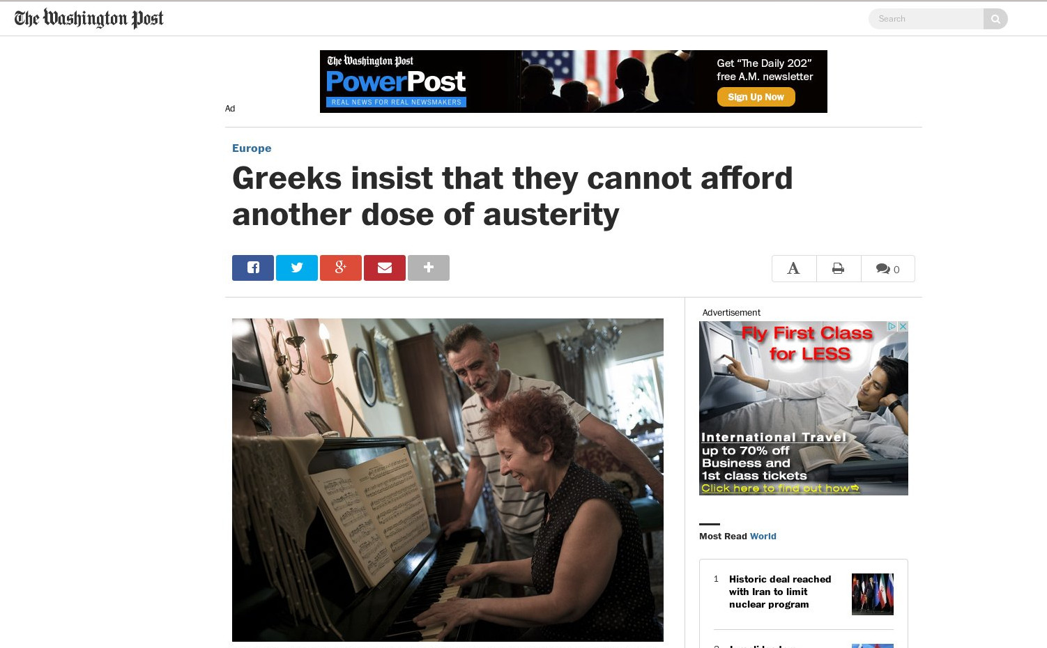 Πέντε χρόνια είναι αρκετά. Οι Ελληνες δεν αντέχουν κι άλλη λιτότητα, υποστηρίζει η αμερικανική εφημερίδα Washington Post, η οποία επισημαίνει πως σήμερα ο λαός πληρώνει τις αμαρτίες του παρελθόντος: εκτεταμένη φοροδιαφυγή, διαφθορά κι ανάρμοστες κυβερνήσεις.