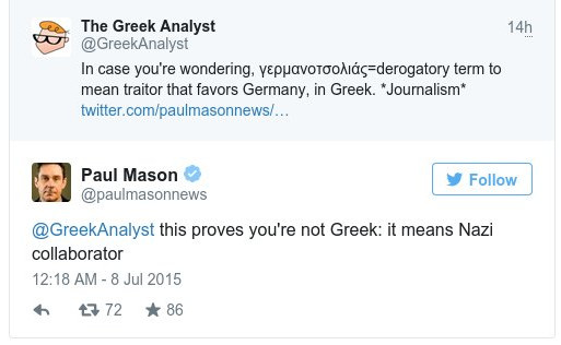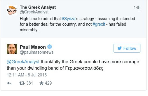 Ο Πολ Μέισον είχε μια πολύ θερμή συζήτηση, στο Twitter με τον μπλόγκερ @GreekAnalyst. Ο τελευταίος ασκούσε κριτική στην ελληνική κυβέρνηση για τη στρατηγική της με τον Μέισον να απαντάει πως «ευτυχώς ο ελληνικός λαός έχει περισσότερο θάρρος από τη δική σου συρρικνωμένη ομάδα των γερμανοτσολιάδων».