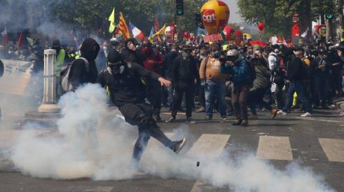 Κάνοντας χρήση δακρυγόνων η γαλλική αστυνομία προσπάθησε να απωθήσει μια ομάδα κουκουλοφόρων διαδηλωτών που ενώθηκαν με τα «Κίτρινα Γιλέκα» στην κεφαλή της πορείας για την Εργατική Πρωτομαγιά στο Παρίσι.