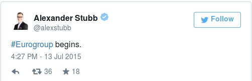 Ο Αλεξάντερ Στουμπ είναι προετοιμασμένος για μία ακόμη μακρά συνεδρίαση. Ο Φινλανδός υπουργός Οικονομικών- ο οποίος ως συνηθίζει ανακοίνωσε μέσω Twitter την έναρξη της συνεδρίασης- δήλωσε μπαίνοντας «Το μεγάλο θέμα σήμερα θα είναι η χρηματοδότηση γέφυρα και προβλέπω ότι αυτές οι διαπραγματεύσεις θα είναι πολύ δύσκολες, γιατί δεν βλέπω πολλές χώρες με εντολή να δώσουν χρήματα χωρίς όρους».