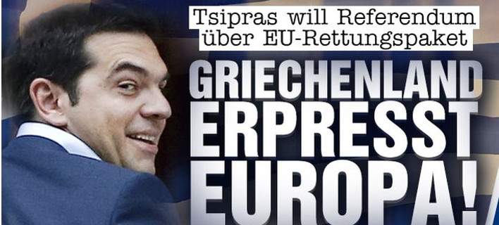 Με τίτλο η «Η Ελλάδα Εκβιάζει την Ευρώπη! Με ένα δημοψήφισμα!» η Bild αναφέρεται στην ανακοίνωση «βόμβα» του πρωθυπουργού.
