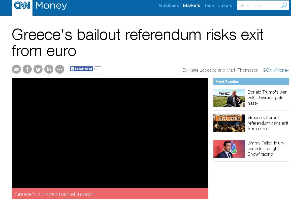«Η ελληνική κυβέρνηση πετάει την πρόταση των δανειστών, διακυβεύοντας το μέλλον της χώρας στο ευρώ», σχολιάζει το CNN, σημειώνοντας ότι αυτή η κίνηση βάζει ένα απότομο τέλος σε μία σειρά συζητήσεων με στόχο της εξεύρεση λύσης. «Αν η Ευρώπη δεν κάνει πίσω τις επόμενες ημέρες, η κίνηση σημαίνει σχεδόν με βεβαιότητα ότι η Ελλάδα δεν θα μπορέσει να πληρώσει τη δόση προς το ΔΝΤ την Τρίτη», συνεχίζει το αμερικανικό δίκτυο στην ιστοσελίδα του.
