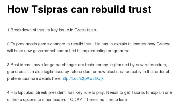 «Η κατάρρευση της εμπιστοσύνης είναι ζήτημα- κλειδί στις συζητήσεις για την Ελλάδα. Αυτό είναι θέμα των ηγετών και όχι του Eurogroup, που θα έπρεπε αντί για αυτό να προσπαθεί να λύσει τα οικονομικά θέματα. Ο Τσίπρας χρειάζεται να αλλάξει το παιχνίδι για να χτίσει ξανά την εμπιστοσύνη. Πρέπει να εξηγήσει στους ηγέτες πώς η Ελλάδα θα έχει μία νέα κυβέρνηση αφοσιωμένη στην εφαρμογή του προγράμματος», έγραψε ο Ντίξον.