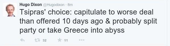 Ο Ντίξον αναφέρει τα εξής: «Η επιλογή του Τσίπρα: Να συνθηκολογήσει σε μια χειρότερη συμφωνία, σε σχέση με αυτό που του προσφέρθηκε πριν από 10 ημέρες και ίσως να διαλύσει το κόμμα του – αλλιώς, να οδηγήσει την Ελλάδα στην άβυσσο».