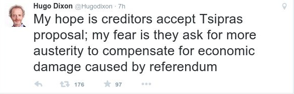 «Η ελπίδα μου είναι ότι οι δανειστές θα αποδεχθούν την πρόταση Τσίπρα. Ο φόβος μου είναι ότι ζητούν περισσότερη λιτότητα ως αντιστάθμισμα στις οικονομικές ζημιές που προκλήθηκαν από το δημοψήφισμα».