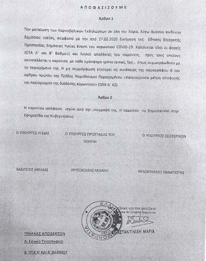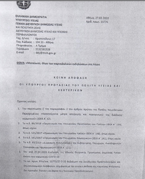 Βάση αυτής «καλούνται όλοι οι φορείς, δήμοι και περιφέρειες και λοιποί αποδέκτες του παρόντος, προς τους οποίους αποστέλλεται η παρούσα με κάθε πρόσφορο τρόπο, όπως συμμορφωθούν με το περιεχόμενό της», δηλαδή την ματαίωση των καρναβαλικών εκδηλώσεων.