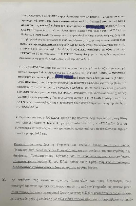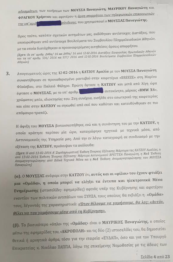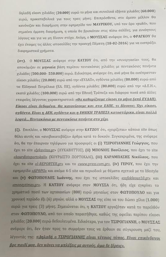 Περιγράφεται ακόμη η στιγμή της σύλληψης των δύο δημοσιογράφων (Μουσσά-Φράγκου) σε εστιατόριο πίσω από το Χίλτον, καθώς και η σύλληψη του εκδότη της «Ακρόπολης» Π. Μαυρίκου έξω από το σπίτι του. Από τις συνομιλίες που έχουν καταγράψει οι αρχές ασφαλείας, αναφέρονται επίσης και άλλα ονόματα δημοσιογράφων που φέρονται να εμπλέκονται στο κύκλωμα εκβιασμών.