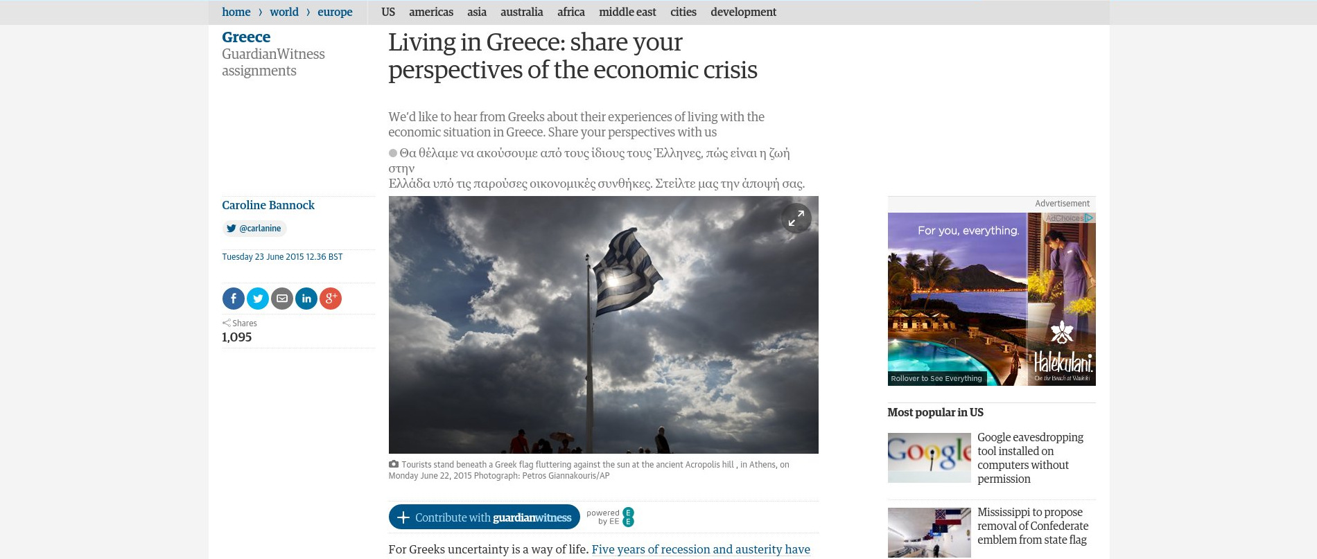 Μια ξεχωριστή πλατφόρμα έχει στην ιστοσελίδα του ο Guardian, καλώντας τους Ελληνες να περιγράψουν τη χώρα και τις ζωές τους στα χρόνια της κρίσης.